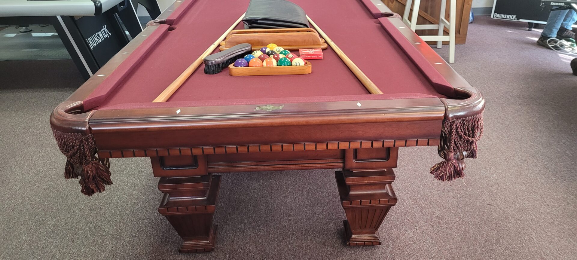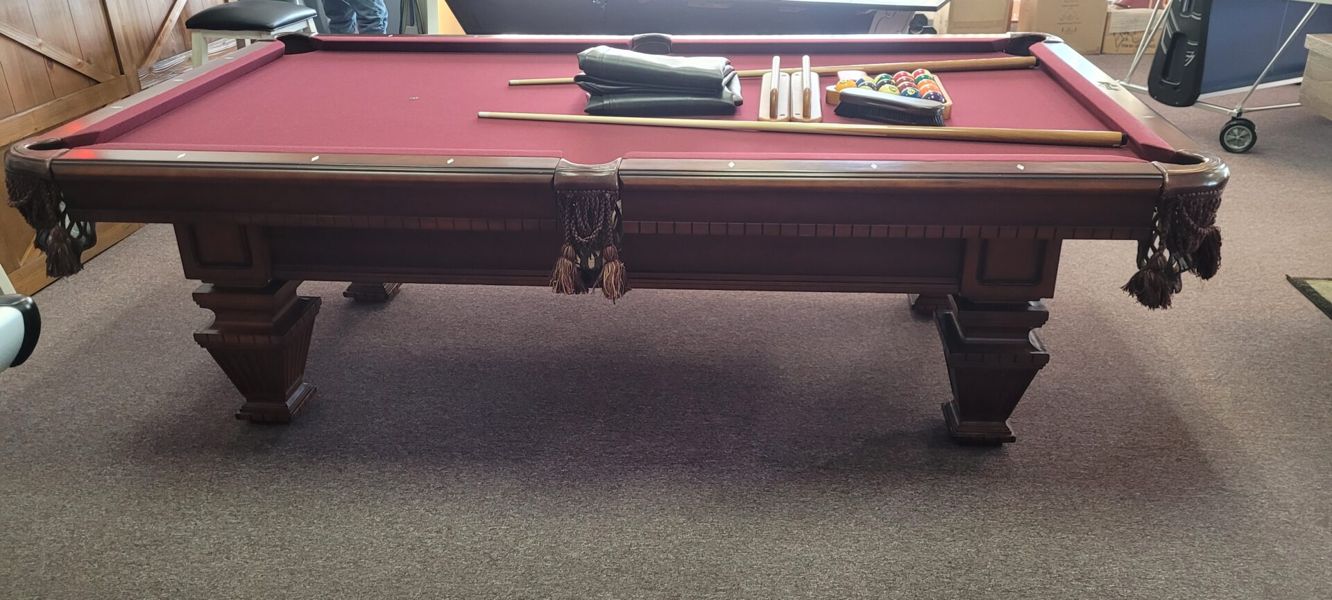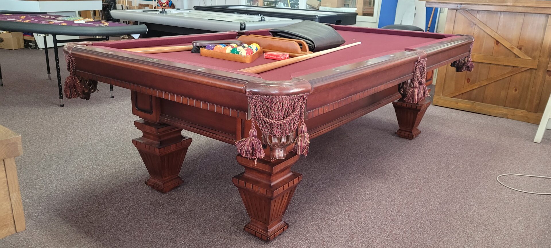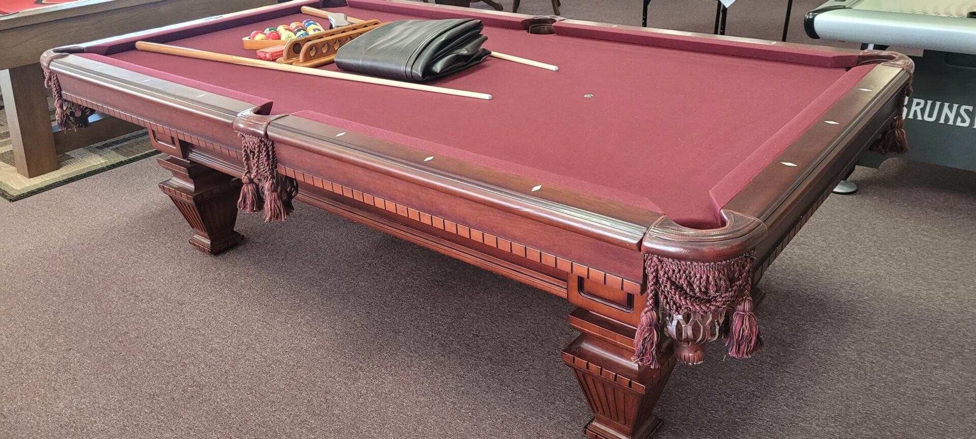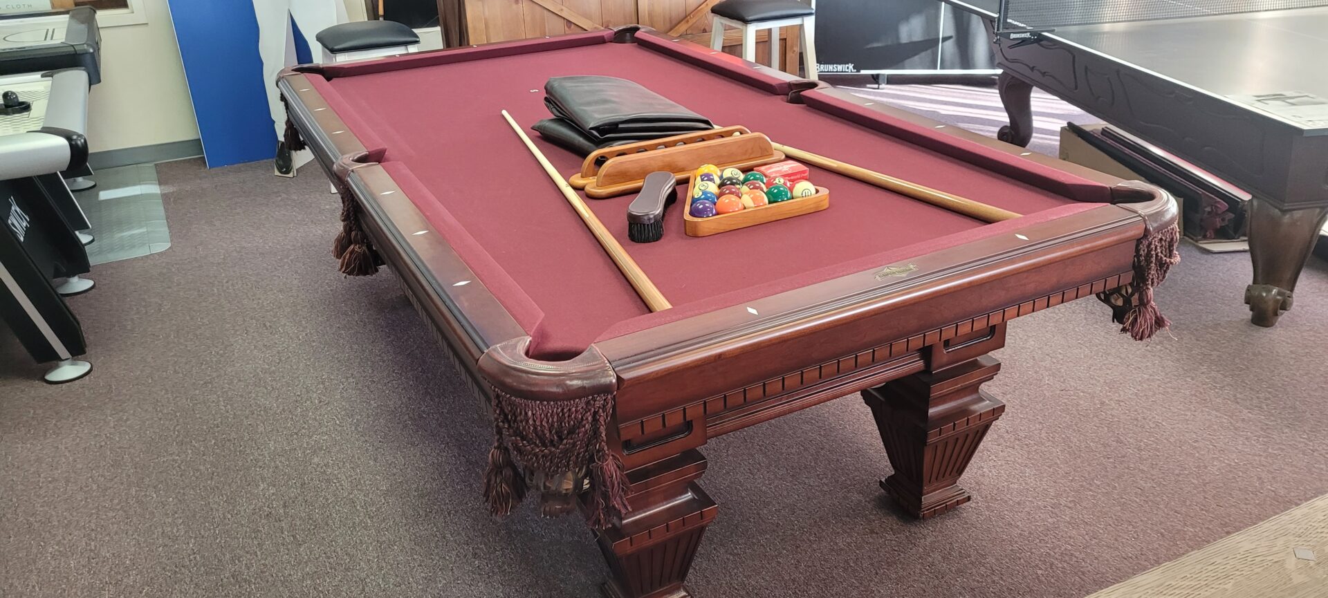 4×8 AMERICAN HERITAGE POOL TABLECategories: Reconditioned Billiard Tables AMERICAN HERITAGE, 4×8 SIZE ONE INCH SLATE, K-66 CUSHIONS, MAPLE WITH MAHOGANY FINISH, DROP NET POCKETS, VERY DISTINCTIVE LOOK FOR A FURNITURE TABLE., $2795.00 DELIVERED AND INSTALLED BALTIMORE/METRO AREA, INCLUDES PLAYING ACCESSORIES