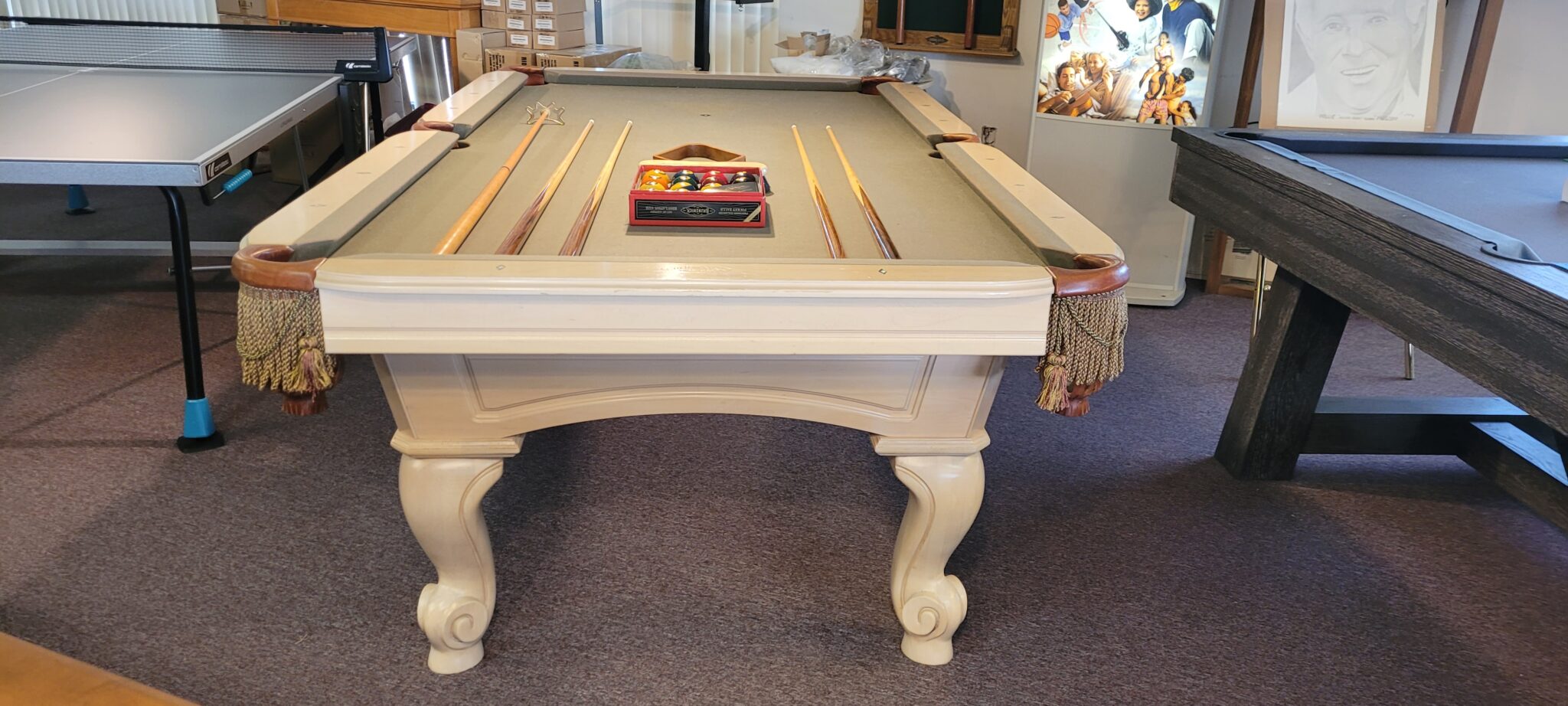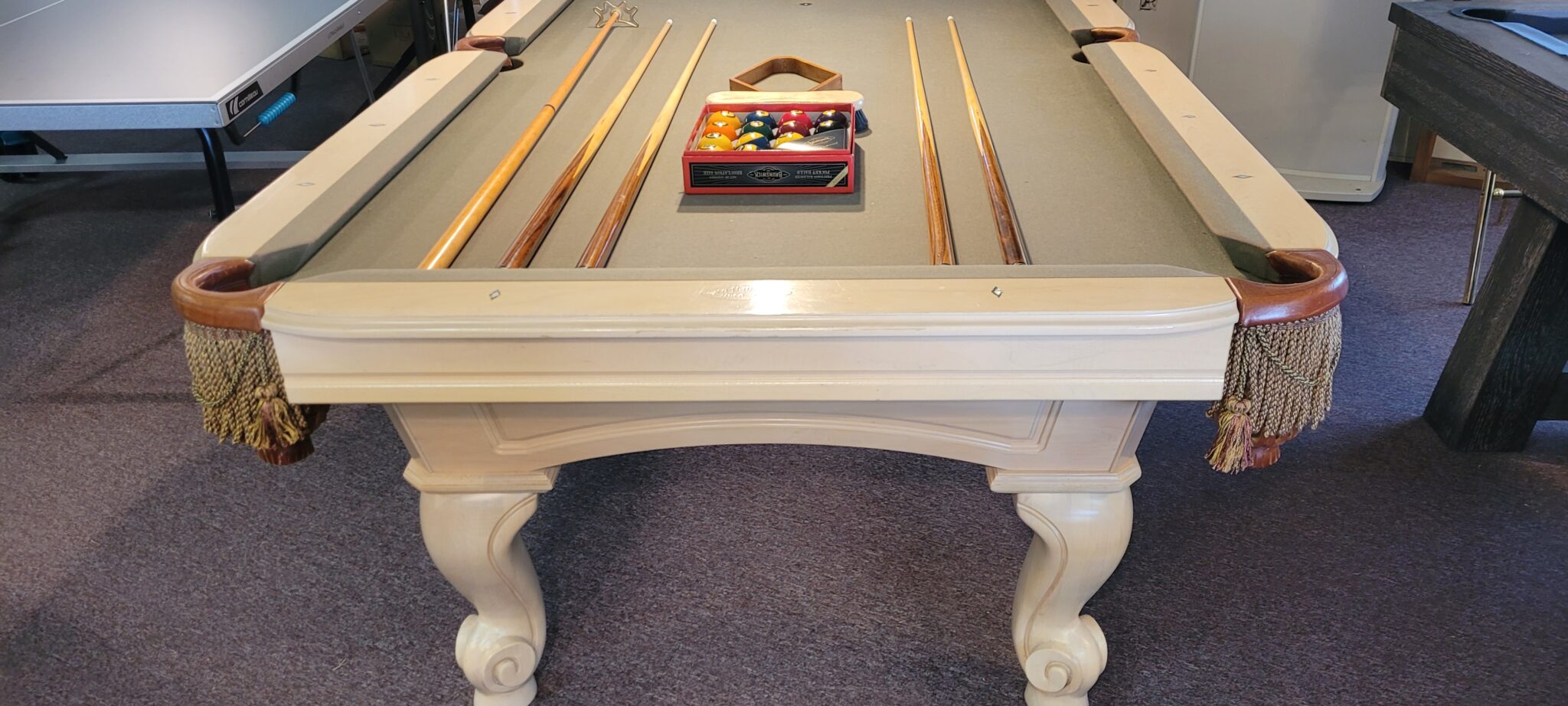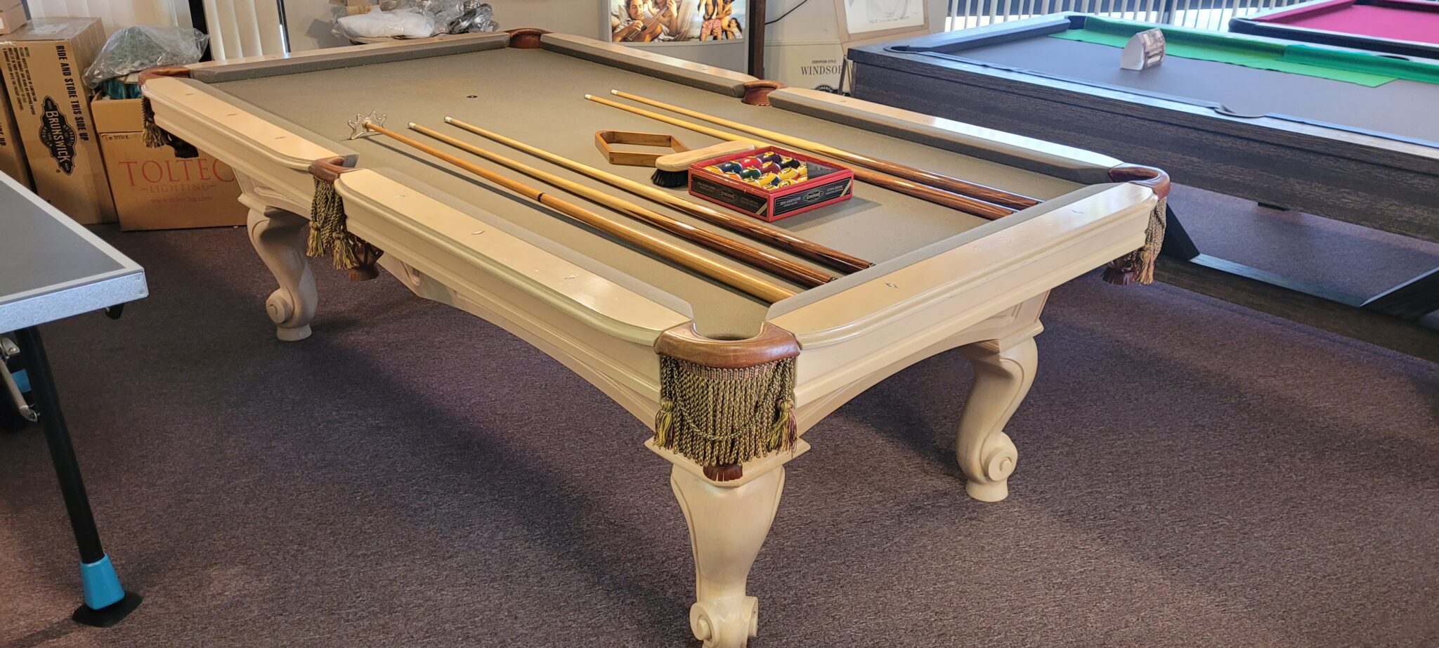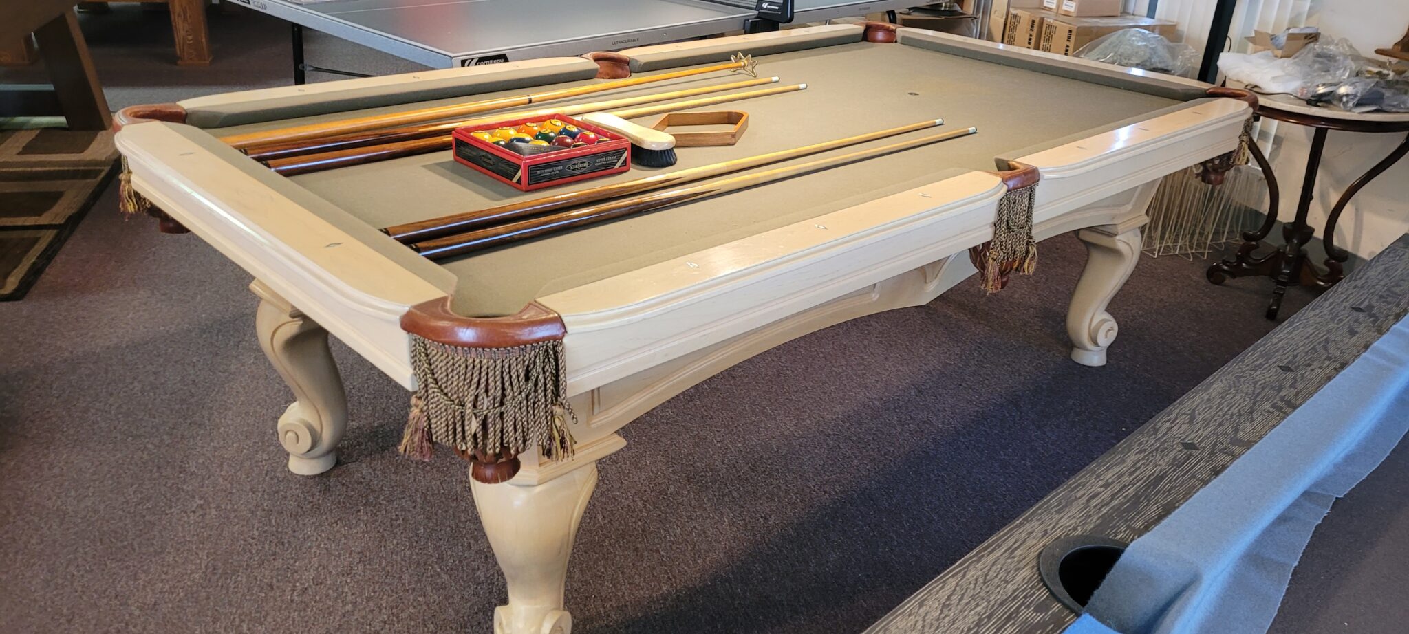 4×8 Size, Craftmaster Claremont, Solid Maple With Pearl Finish, Mother Of Pearl and Abalone Diamond Sites, New K-66 Cushions, One Inch Framed Slate, Drop Leather Pockets, Your Choice Of Felt Color $2895.00 Delivered and Installed Baltimore/Metro Area, Includes Playing Accessories.