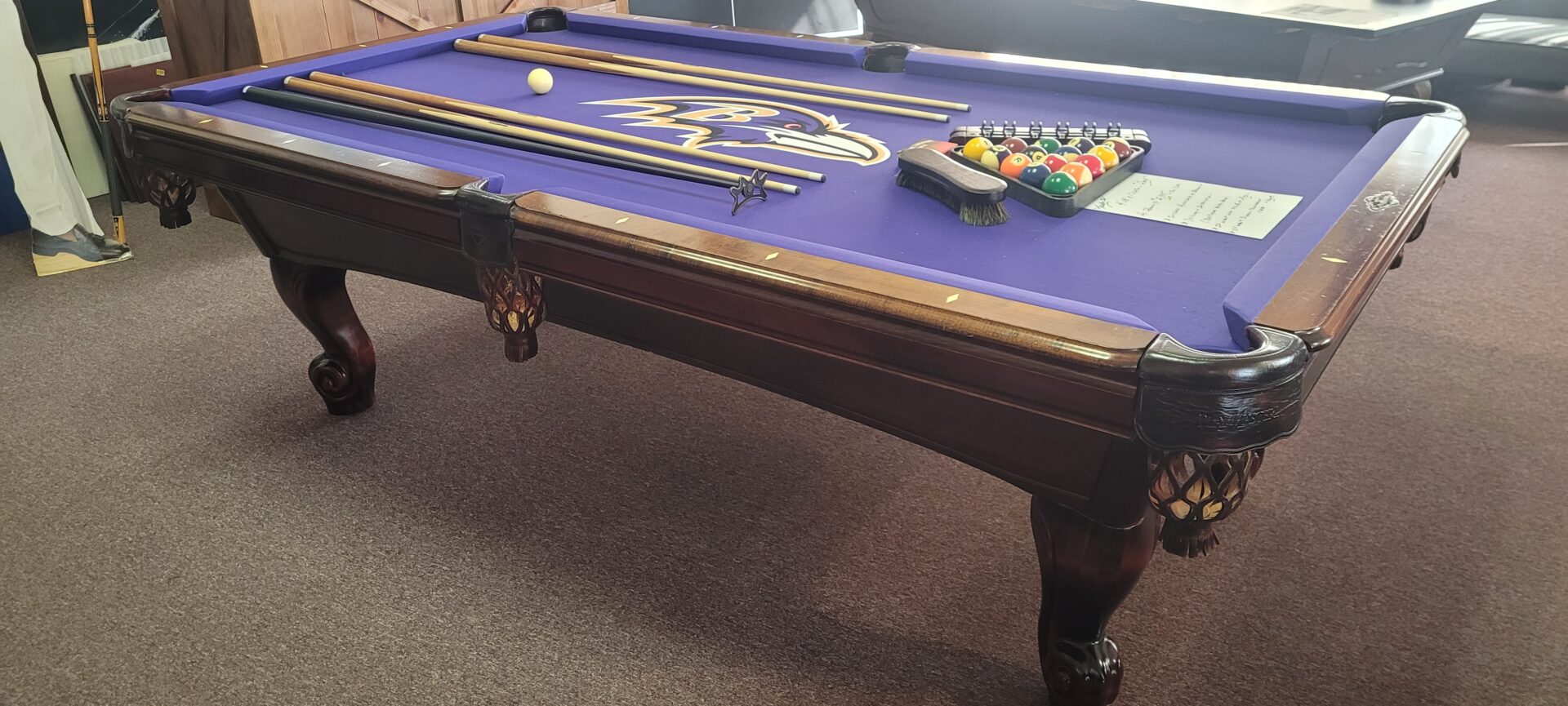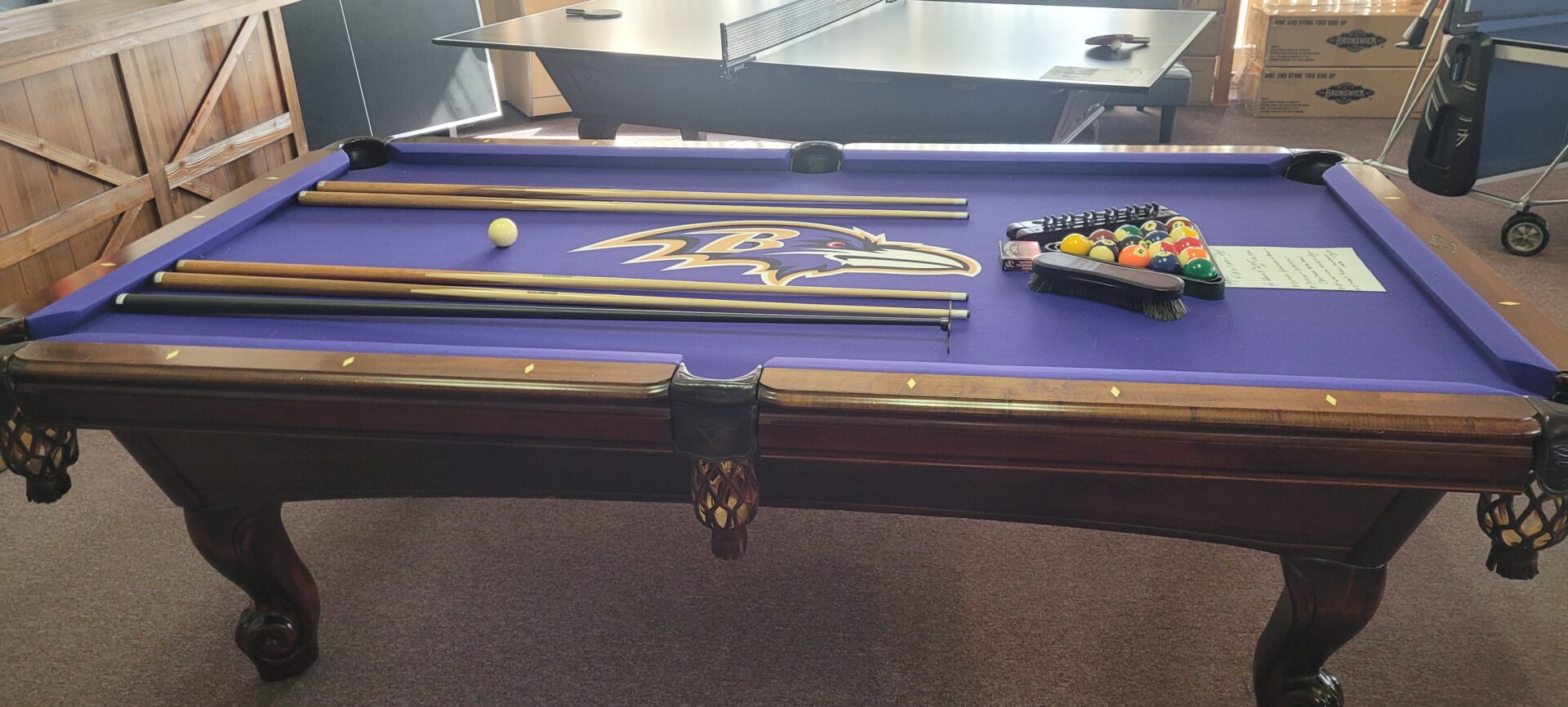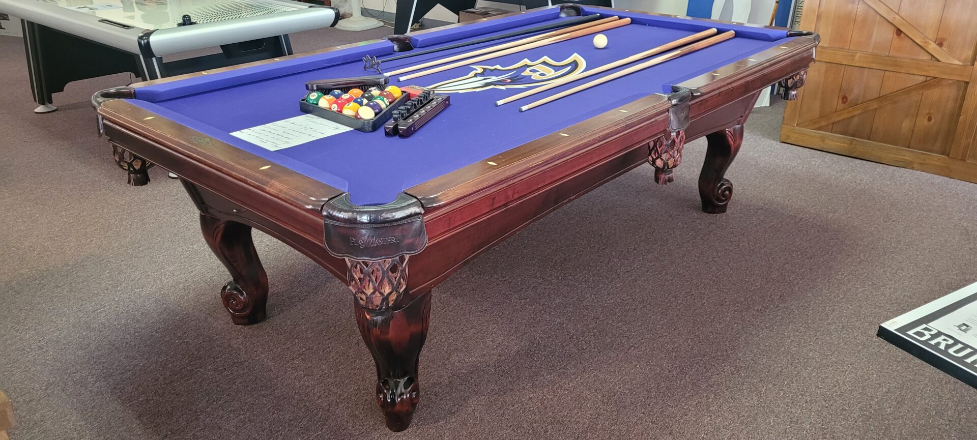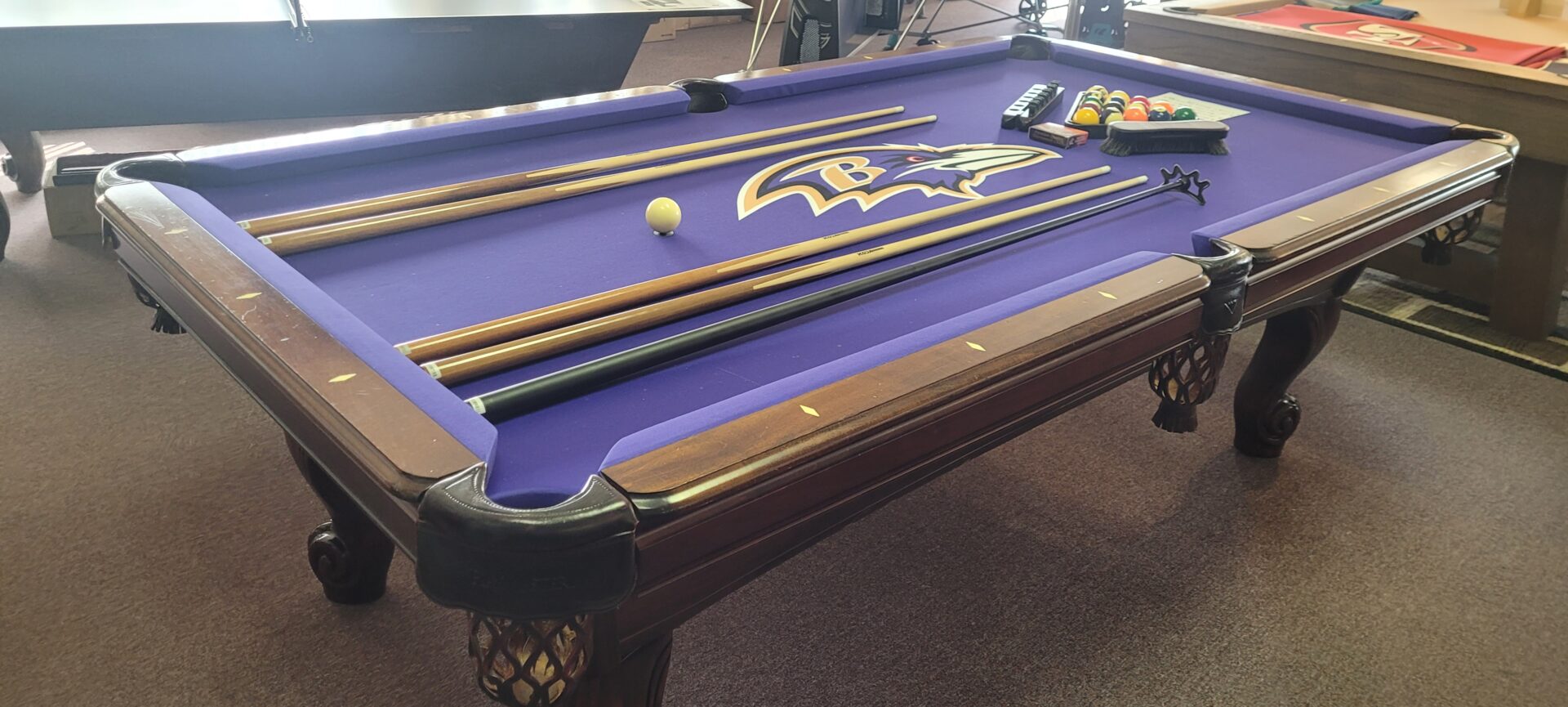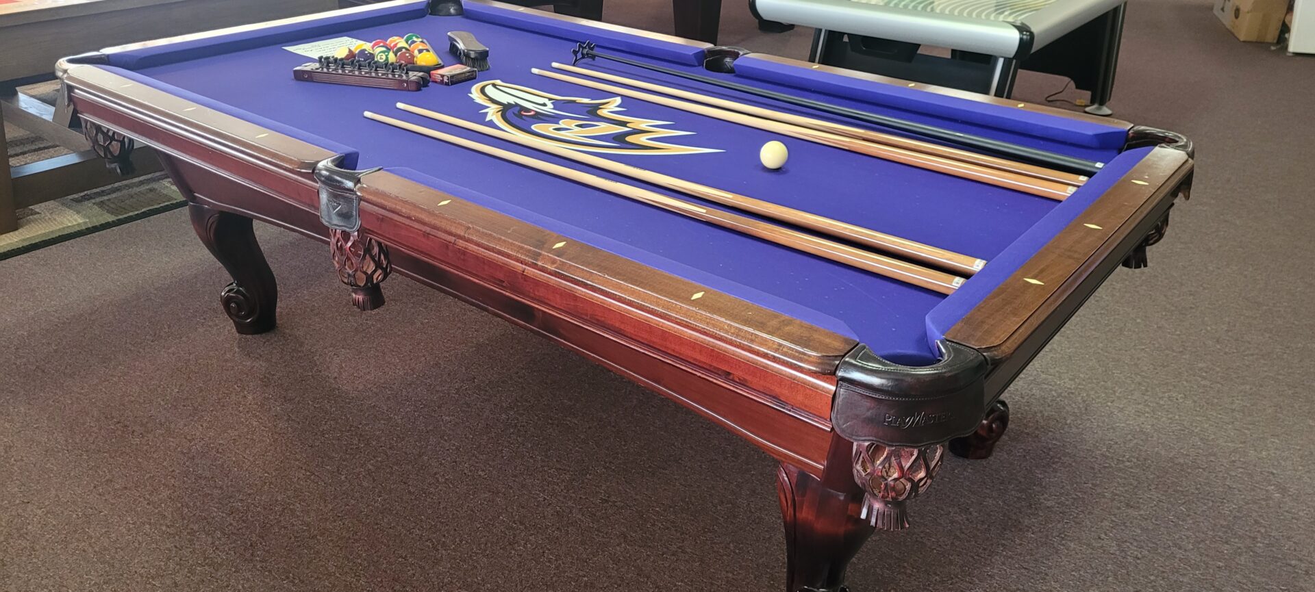AMF PlaymasterCategories: Reconditioned Billiard Tables AMF Playmaster, 4×8 Size, One Inch Slate, Solid Maple With Cherry Finish, Drop Leather Pockets, K-66 Cushions, Raven’s Logo Cloth, $2395.00 Delivered And Installed Baltimore/Metro Area, Incudes Playing Accessories.